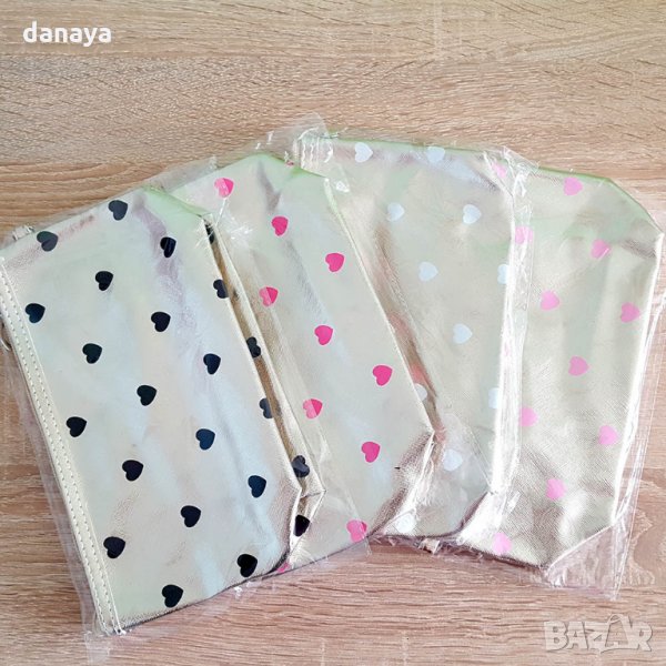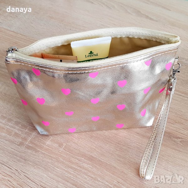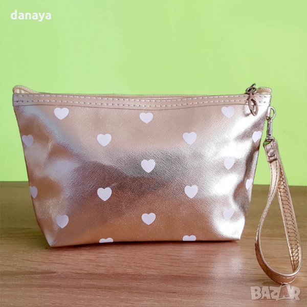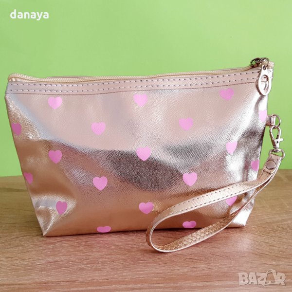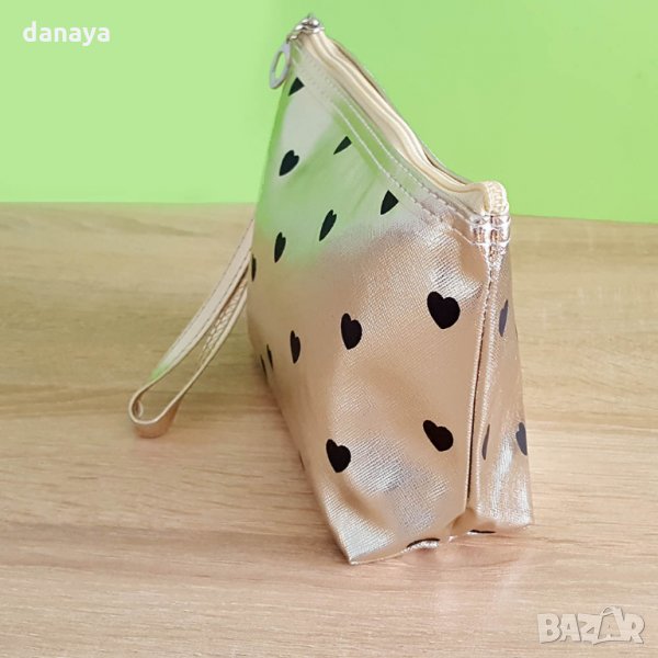 Козметичен несесер в лъскав златен цвят на сърца. Материята отвън е имитация на кожа, отвътре - полиестер. Козметичка, която е достатъчно малка, за да се побере в дамска чанта. Подходящ за използване и като несесер за четки за грим. В него може да съхранявате моливи, маски, червила, коректори и други дребни предмети.