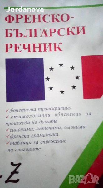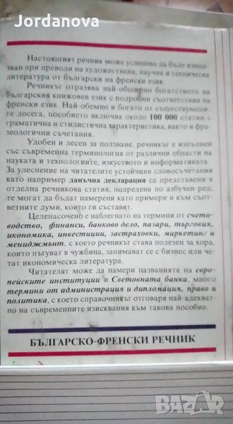 Българско-френският речник включва ок. 100 000 думи в основни статии и в словосъчетания - най-важната част от лексиката на съвременния български и френски книжовен език, както и основните термини от различни области на познанието. Има приложени таблици за спрежение на глаголите и др. цена 10лв.