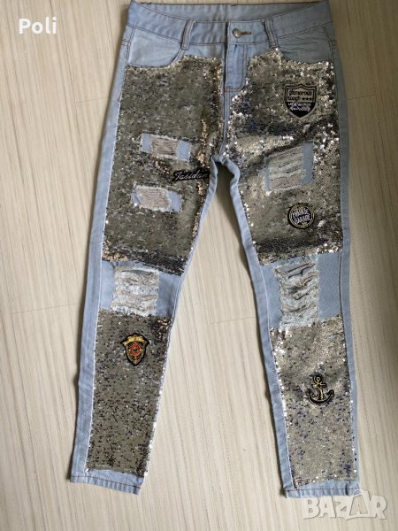 Дънките са нови и са уникат. Нямат еластичност. С пайети и апликации. Отговарят на Xs размер или 25ти.