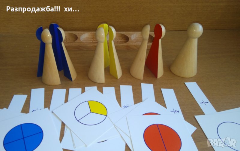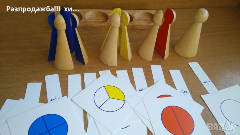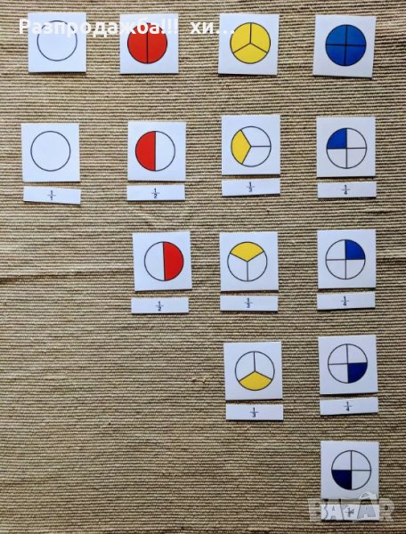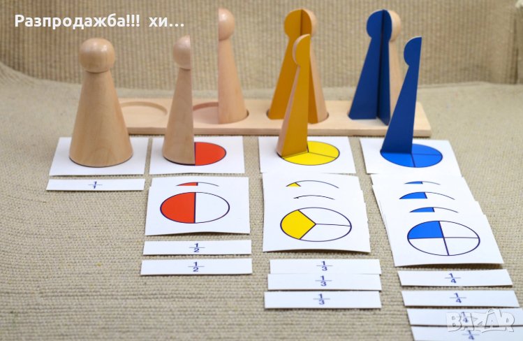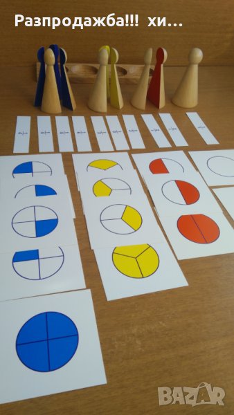 Монтесори фигури за деления 1 ,1/2 ,1/3 и 1/4 + карти и поставка