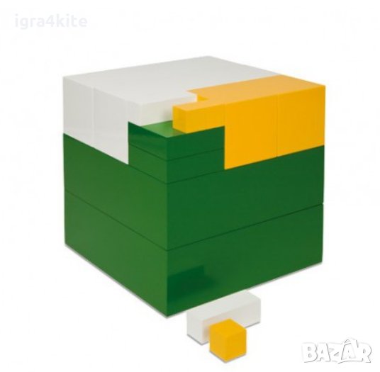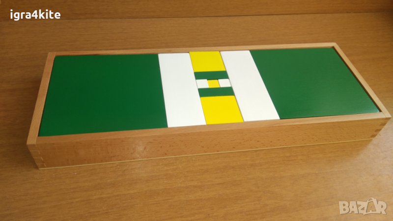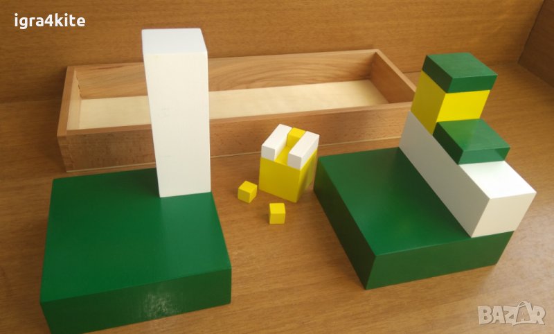 Зеленият малък блок с размери : 4.5см.х1.5см. също е в 3 пъти по малък от следващия по големина най-близък до него -Жълт куб с размери 4.5см. х4.5см.