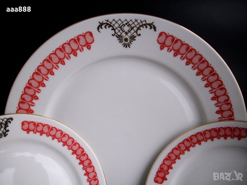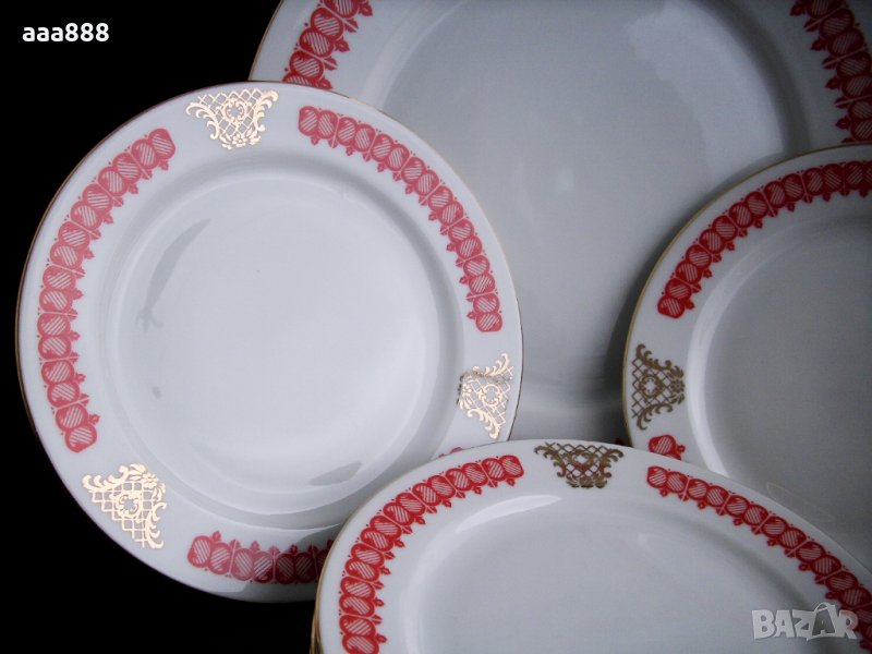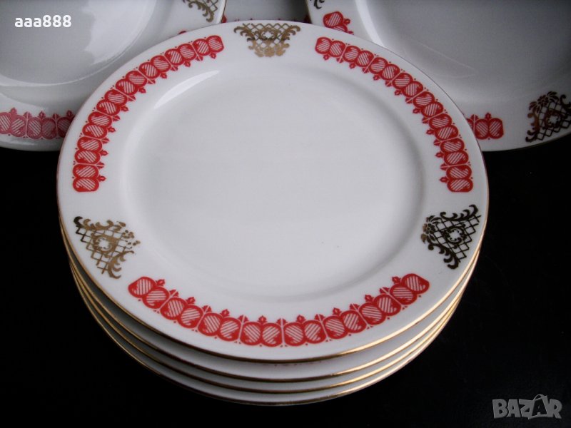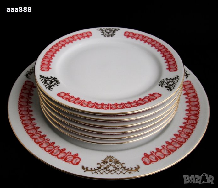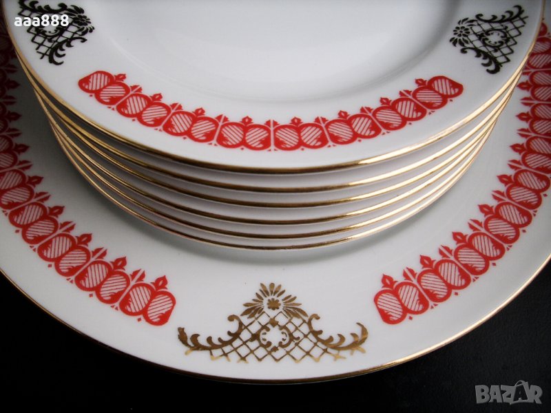 Сервиз за торта от първокласен порцелан Бохемия, чехословашко производство. Декорация в червено и дълбоко позлатяване. Състои се от една голяма чиния и 6 малки чинии. Нов, неупотребяван.