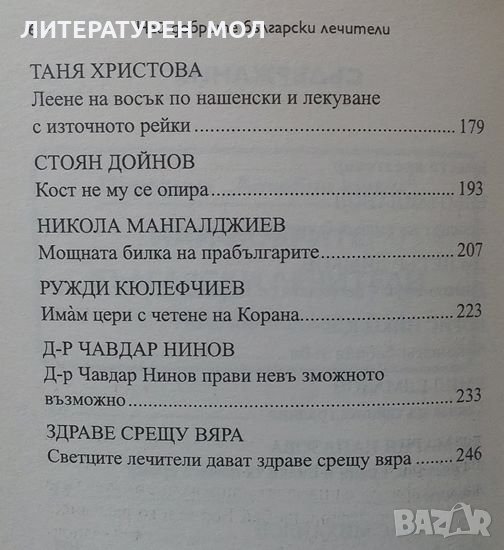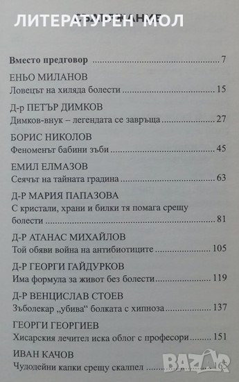 И така до билкаря Еньо Миланов застава лекарят офталмолог Петър Димков, внук на най-великия български лечител, който от четвърт век продължава делото на дядо си. След него идва и откритието за билката бабини зъби. Четирима от лечителите в тази книга са титулувани лекари, един е член на БАН, друг преподава на студентите в Медицинска академия, трети пък има над 50 дипломи и сертификати от цял свят, а четвърти е написал книга за ... народната медицина. Тук се разказва за лечител, изнамерил формула, за която от 20 години е обещана Нобелова награда. И за биохимик, който топи с билков екстракт ненужния холестерол и отпушва стенози, т.е. открил е средство против инфаркт и инсулт.