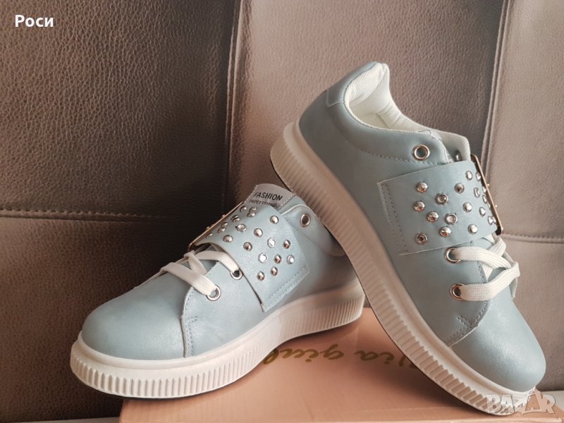 светло сини кецове с катарама и капси , бяла платформа , лакирана еко кожа - стандартен размер 37