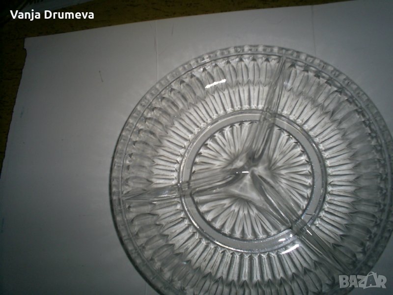 Платото е от дебело здраво и гравирано стъкло. С 3 прегради и диаметър 24 см. Качество от годините на соца. Без забележки.
