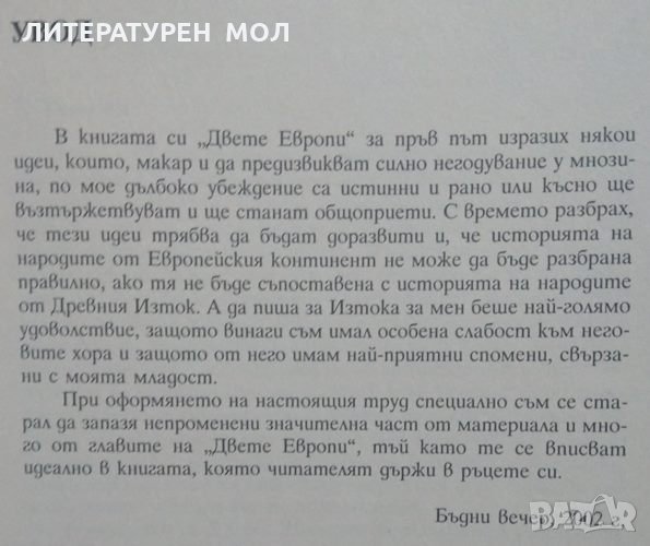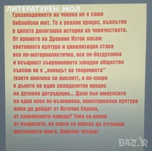 Грехопадението на човека не е само библейски мит. То е реален процес, въплътен в цялата досегашна история на човечеството. От времето на Древния Изток насам световната култура и цивилизация става все по- материалистична, все по- бездуховна и всъщност съвременното западно общество съвсем не е "венецътна творението", а по- скоро е дъното на един хилядолетен процес на духовна деградация... дали пък импулсите на една нова по-възвишена, нематериална култура няма да дойдат от Източна Европа, от славянските народи? Това са някои от въпросите, на които се опитва да отговори настоящата книга.