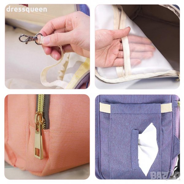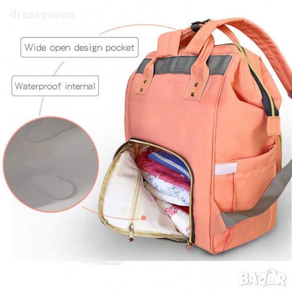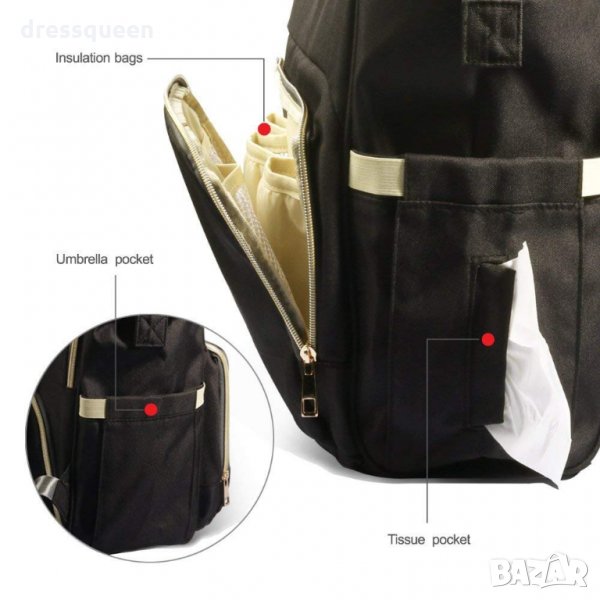 Голям капацитет на побиране: основно отделение с много отделни персонализирани джобове с функция на органайзер за бебешки приспособления, биберони, залъгалки, памперси и играчки