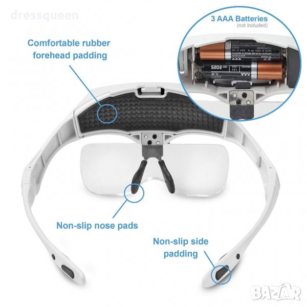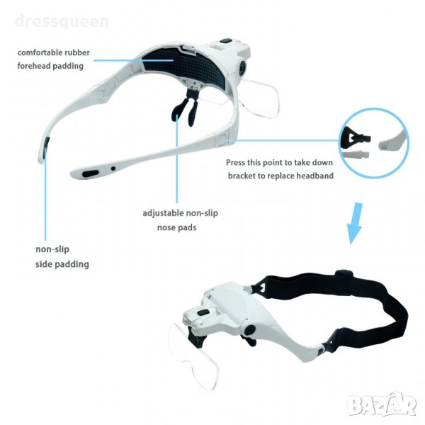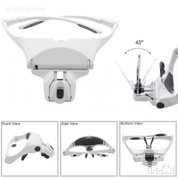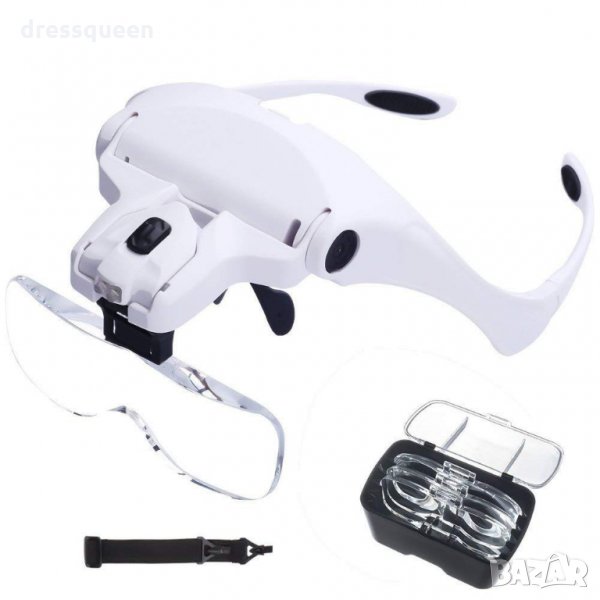 Лупа за глава с различни видове увеличения според нуждите с рамка като очила или регулируема еластична лента на главата за по-лесно използване.