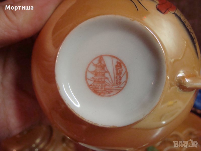 Хоншу, където се намира най-високия връх в Япония и затихнал вулкан Фуджи.Ръчно рисувани,порцелана е емайлиран с опалин - блести и мени своите оттенъци в зависимост от светлината. Свръх ефирни - чашката тежи едва 32 гр. височината им е 4.5 см.,диаметър 9см чинийки с диаметър 13 см ,захарница и каничка за мляко Една от чашките е с различен рисунък и без чинийка В перфектен вид ( не ползван част от колекция )без забележки