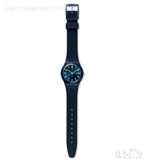 Swatch GN718 Classic Sir Blue unisex часовник разполага с 34 мм широк и 9 мм дебел син пластмасов калъф с фиксирана рамка и текстурирана тласкаща корона. Swatch GN718 се захранва от швейцарско кварцово движение. Този стилен часовник също има остър изглеждащ син циферблат със зелени акценти, сребристи тонове, светли ръце и арабски цифри за час, заедно с функциите за показване на ден и дата, устойчив на надраскване акрилен кристал и водоустойчив до 30 метра. Swatch GN718 е снабден с 20мм широка синя силиконова гумена лента с закопчалка за закопчаване.