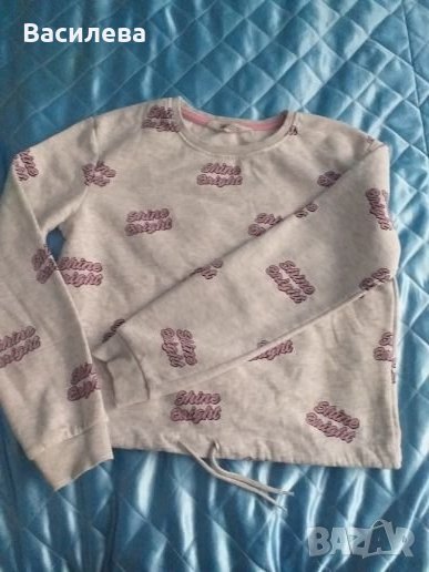 Детска блузка на НМ, за 10-12 год. Размери подмишница 44 см, от рамо до рамо 40 см, дължина 46 см, дължина ръкав 54 см. Обличана е няколко пъти. Леко ватирана. Памук 69 %, 30% полиестер и 1% вискоза.