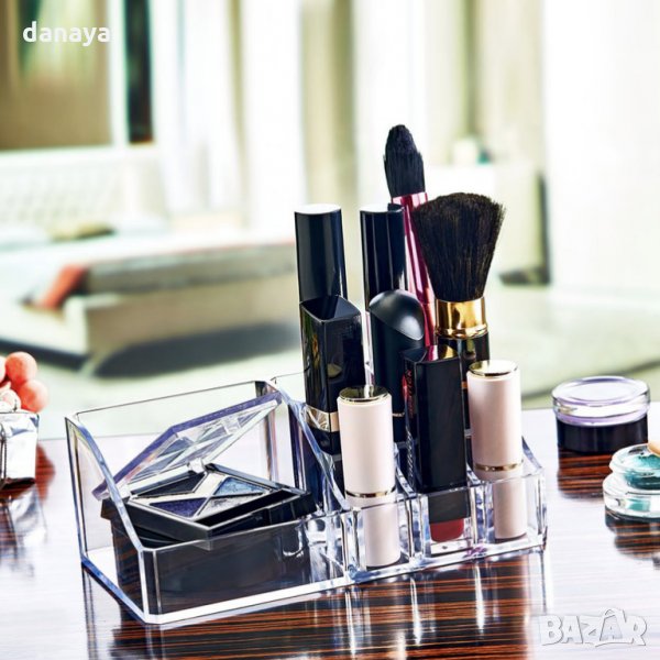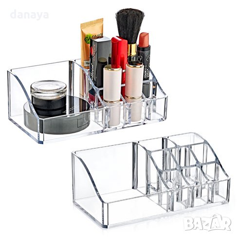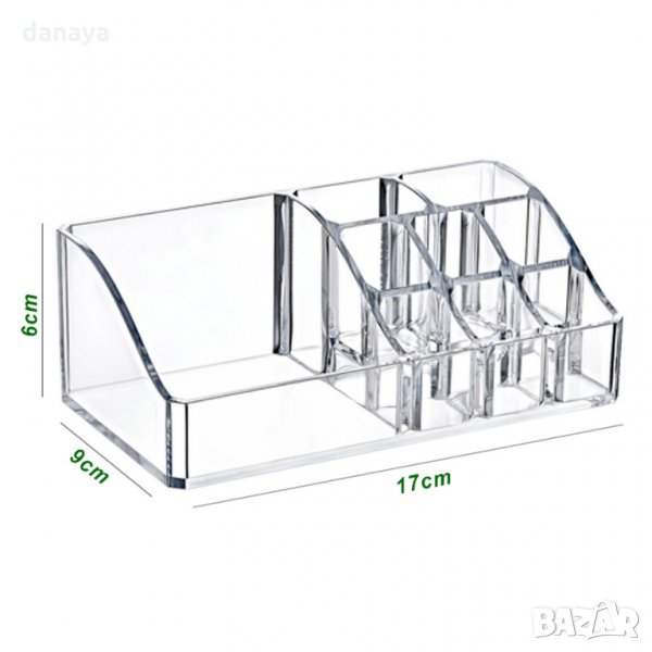 Прозрачен органайзер за козметика и гримове с 9 отделения. Идеален органайзер за червила, четки за грим, спирали, кремове и други козметични аксесоари. Удобен и практичен органайзер, който стои идеално пред огледалото или плътно до стената, тъй като разползага с плосък гръб. Изчистен и семпъл дизайн. Изработен от прозрачен акрил.