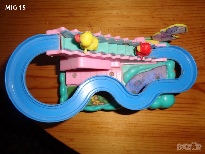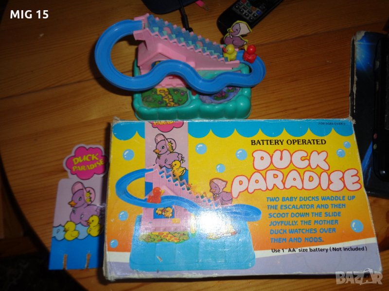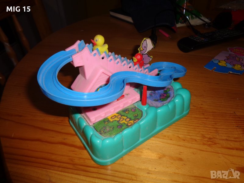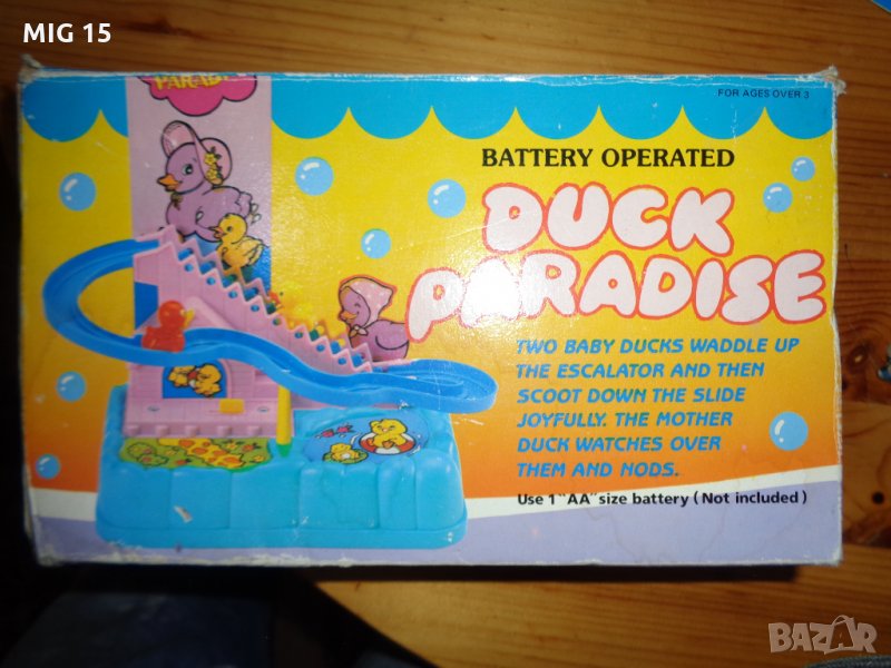 Продавам стара китайска механична пластмасова играчка.Работи с една батерия АА 1,5 волта.Има движеща се стълбичка , която издига нагоре 2 патета.Когато достигнат улея се спускат надолу и после пак се изкачват нагоре.Играчката работи , но трябва да бъде поставяна на равно място .Има и оригинална кутия.