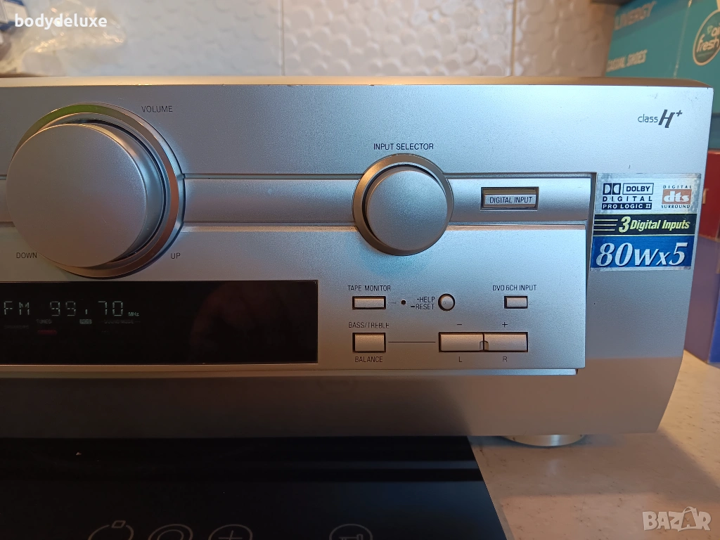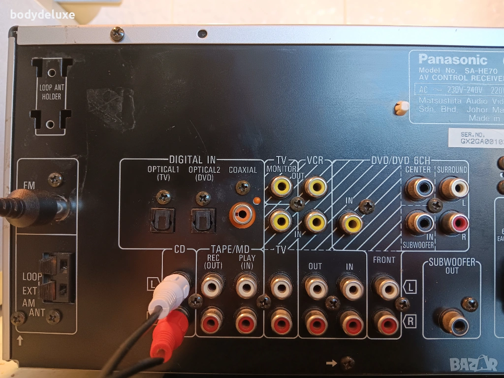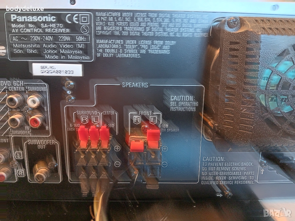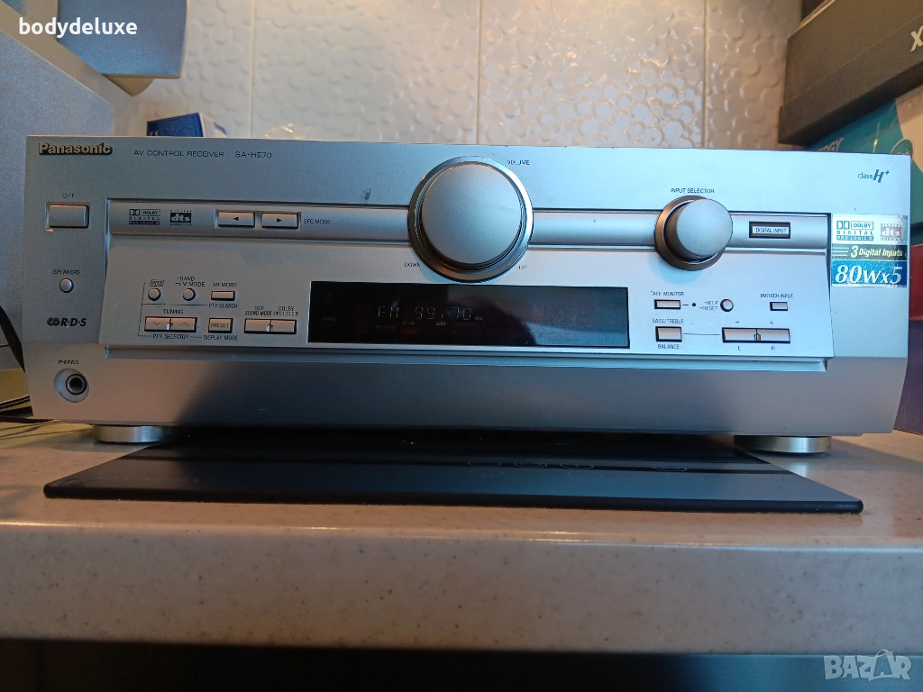5.1 ресивър за домашно кино Panasonic SA-HE70. С много добър външен вид и функциониращ отлично. Декодери: Dolby Digital Pro Logic II и DTS. Разполага с два оптични и коаксиален входа. Стерео тунера може да запаметява 30станции, има RDS. Изходна мощност в режим домашно кино 5x80w/6ohm, а в стерео режим 2x80w/6ohm. Произведен в Малайзия.