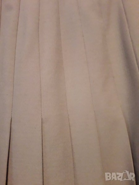 Дамска пола на едри плисета, много хубав плат, цвят светлобежов - слонова кост, размер S-М, около 40-42 българска номерация, размери талия 37-38 см /или обиколка 74 -76 см/, ханш 50 см /или 100 см обиколка/, дължина на полата 62 см /има и подгъв/. Отговарям на съобщения тук, изпращам с куриер с отстъпка или лично предаване в София по избор.