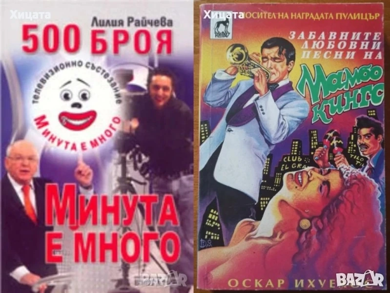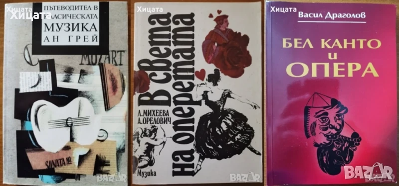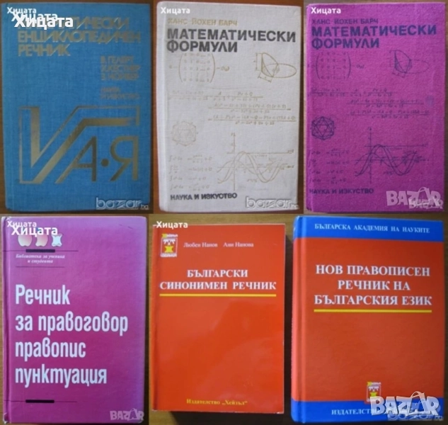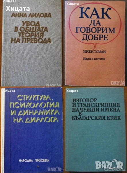 Учебник по пеене и методика на музикалното възпитание в детската градина,Савка Неделчева и Радка Кръчмарска,Народна Просвета,1965г.344стр. Учебник за институтите за детски учителки. - 60лв Математически формули,Ханс-Йохен Барч,Наука и изкуство,1986г.528стр. - 35лв. Математически формули,Ханс-Йохен Барч,Наука и изкуство,1990г.528стр.Отлична! - 40лв. Математически енциклопедичен речник,Валтер Гелерт, Херберт Кестнер, Зигфрид Нойбер,Наука и изкуство,1983г.690стр. - 70лв. Нов правописен речник на българския език,БАН,Изд.Хейзъл, 2002г.1070стр. - 65лв. Български синонимен речник,Любен Нанов; Ани Нанова,Изд.Хейзъл,2000г.648стр. - 55лв. Речник за правоговор,правопис,пунктуация,Димитър Попов,Кирил Семов,Светломира Видинска,Атлантис КЛ,1998г.918стр. - 50лв Музиката в българското радио 1930-1944,Антоанета Радославова-Дойчева,2010г.394стр.С посвещение и автограф от Антоанета Радославова-Дойчева.- 60лв В света на оперетата,Л. Михеева, А. Орелович,Музика,1983г.328стр. - 20лв Пътеводител в класическата музика,Ан Грей,Валент,1994г.400стр.Отлична! - 20лв Бел канто и опера,Васил Драголов,Рал-Колобър,2004г.248стр.Отлична! - 35лв Произход на поезията и музиката.Работа и ритъм.С приложение от Г.В.Плеханов: Изкуството у първобитните народи.София,Изд.На Буревестник,1908 г. Карл Бюхер Превод Я.С.Хлебаров и Г.Бакалов,182стр. - 70лв Музиката като предмет на логиката,Алексей Лосев,Иван Вазов,1996г.272стр. - 50лв Увод в общата теория на превода,Анна Лилова,Народна култура,1981г.344стр. - 35лв Как да говорим добре,Иржи Томан,Наука и изкуство,1983г.366стр.Отлична! - 25лв Структура,психология и динамика на диалога,Жана Николова-Гълъбова,Народна просвета,1985г.248стр. - 30лв Изговор и транскрипция на чужди имена в българския език,Колектив,Наука и изкуство,1974г.488стр. - 25лв 500 броя Минута е много,Лилия Райчева,България,2006г.368стр.Отлична! - 40лв Забавните любовни песни на Мамбо Кингс,Оскар Ихуелос,Плеяда,1993г.448стр. - 30лв