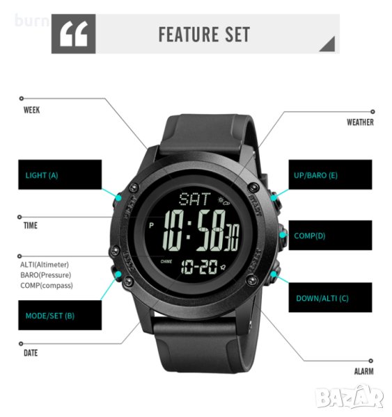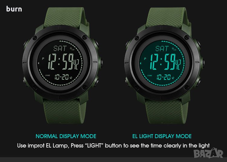 Модел-1793 виж снимките от 10 снимка нататъкчерен с черна каишка. Часовника е със същите функции като 1427 и 1418, размера е малко по-голям и с по-големи цифрихарактеристиките са едни и същи и на двата моделачасовника е предварително тестван, ,часа е настроен но може да си го настроите отновоХарактеристика:1. Многофункционални. Висотомер, мярка за налягане, термометър, прогноза за времето, е идеален за катерене, пътуване и др.Настройка на метрични или английски единици за измерване-км/инч,метри/фут2. Функцията Компас е необходима за работа на открито.3. Спортен партньор, като крачкомер, той може да записва калории, разстояние, километраж, данни за метронома за 7 дни, настройка на дължината на крачката в см.настройка на килограми4. Хронометър, таймер-обратно броене, отчитане на времето за удобно използване на спорта.5. Водоустойчивост. Може да се използва за дейности на открито. Не се притеснявайте за намокряне, когато миете ръката си.6. Също с аларма, време за две места, функция за настройка 12/24 часа.7. Звуков сигнал на всеки кръгъл час.Материал на корпуса: ABS и неръждаема стоманаС материал: PUДиаметър на циферблата 36мм: общо- 46 mmДебелина на корпуса: 14ммширина на каишката: 22 ммДължина на каишката за китката: регулируема-25см.Тегло: 45 гр.Водоустойчива дълбочина: 3АТM - ВИЖТЕ СТАНДАРТА ЗА ВОДОУСТОЙЧИВОСТ СПОРЕД -3АТМ стандартаДълбочина на съпротивление на водата:3Bar Не е за плуване, гмуркане, къпане Цифрови ръчни часовници прозорец Тип материал-Смола Функция: налягане / двойно време-часови зони / алтиметър / разстояние / термометър / прогноза за времето / компас / крачкомер / калории / спортна пробег / съхранение на данни / EL подсветка / 12/24 час / хронометър време / отброяване / 2 групи аларми / Показване на седмица / календар.Ако някой се затруднява за настройването по долу на линка има допълнителни инструкции Копирайте линка в браузъра за още инструкции за по-лесно настройване на часовникаhttps://almost-a-technocrat.blogspot.com/2018/11/a-better-skmei-1418-1427-instructions.htmlСъдържание на пакета:1. спортен часовник-SKMEI с лого на марката2. ръководство за употреба-английскиИзпращане с Еконт, Спиди с 5-10% отстъпка ,преглед и тест