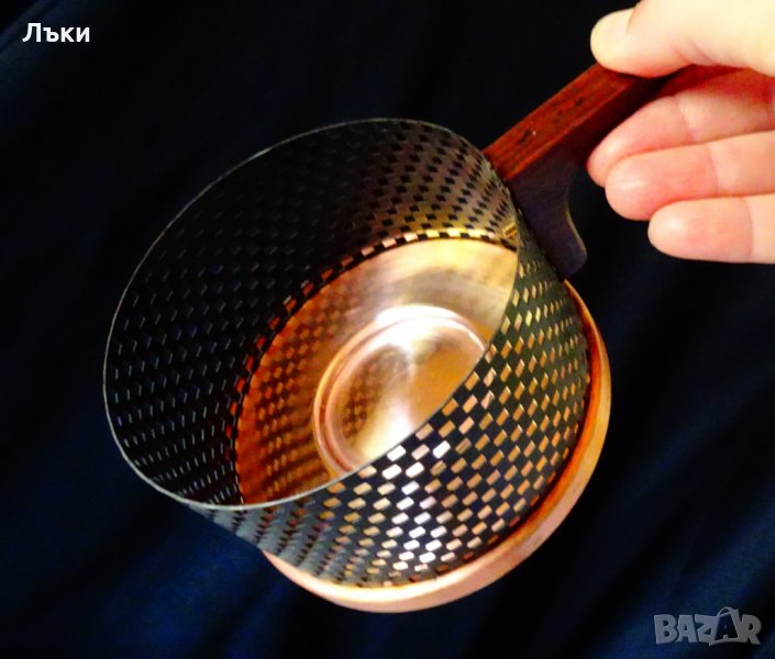 изработка от чиста червена мед с дръжка от естествено дърво.Височина 7 см.,диаметър 10 см.,дължина на дръжката 6 см.Тегло 160 гр.