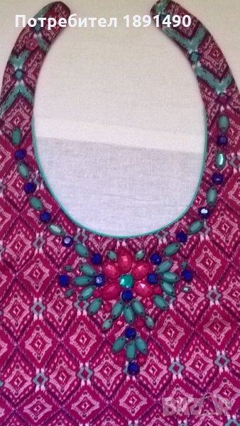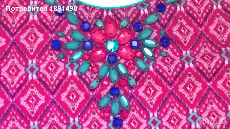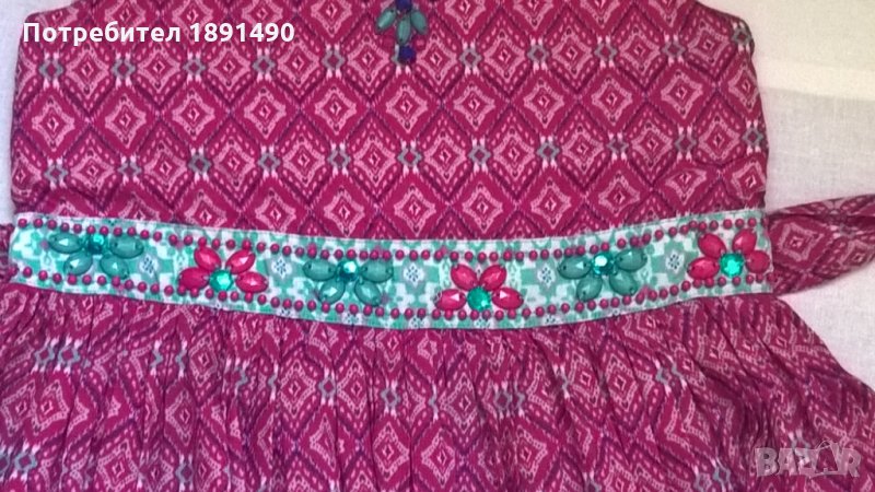 Елегантна рокля с подплата, изработена от много фина материя, с камъни отпред и на колана, целия гръб е еластичен, коланът се завързва отзад на панделка. Закопчаването на врата е с малко копче и има 2степени. Подходяща както за официални случаи, така и за ежедневно ползване за разходка по градските улици.