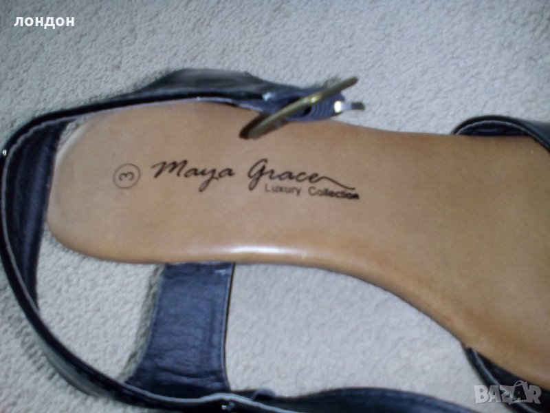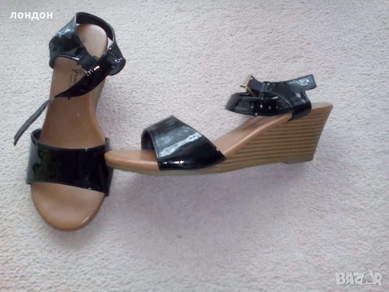 Дамски сандали черни с равна подметка /платформа/. Естественна кожа,отгоре покритие от лак, може да се каже ,че са нови.Само са пробвани.Закупени са от магазина на TK MAXX London 55
