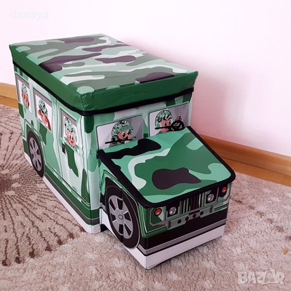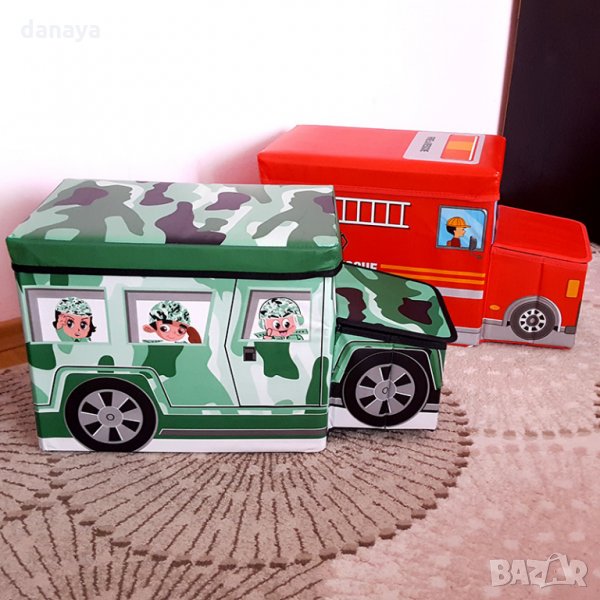Детска сгъваема кутия автобус. Сгъваем кош за играчки с форма на пожарна, полиция или маскировъчен бус. Голяма кутия за съхранение на играчки в детксата стая или други аксесоари в дома. Състои се от две отделения. Кутията се сгъва, когато не е необходима и не заема място. Ярки и красиви цветове! Здрава конструкция - може да се използва като столче, табуретка. Изработен от здрава тъкан с подсилващи елементи.