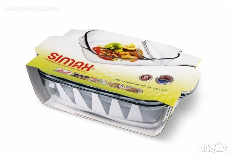 Правоъгълна тава 3.2 л. с капак 2.3 л. за готвене без мазнина SIMAX. Размери с монтиран капак - 365 мм х 208 мм х 135 мм. Височина на основата - 80 мм. на капака - 55 мм. Тегло - 2.9 кг. Стъклото не съдържа кадмий и олово. Произход - Чехия.