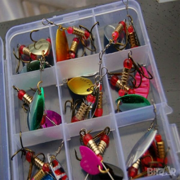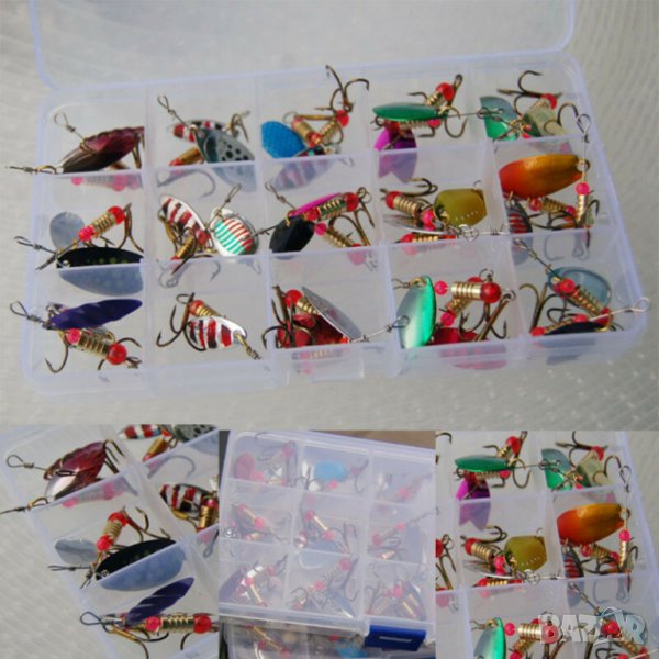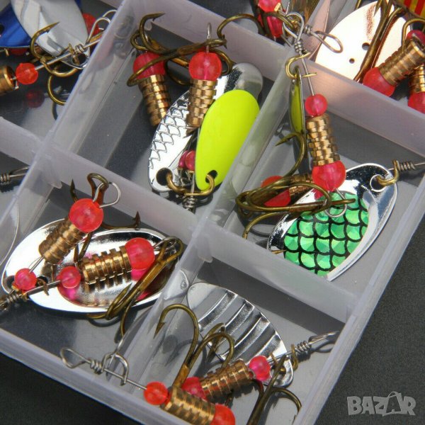 30(тридесет) броя въртящи се метални блесни и кутия за съхранение.