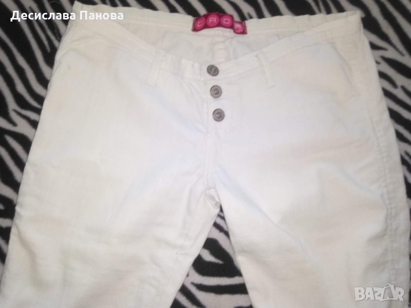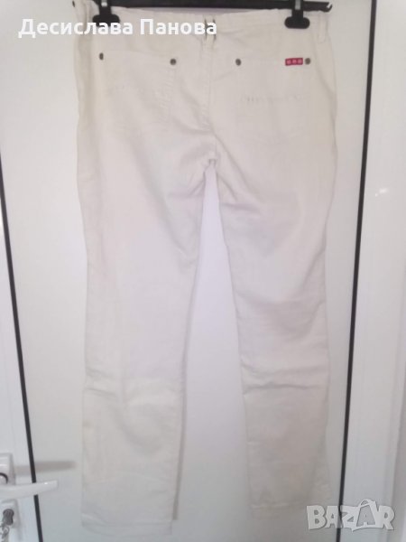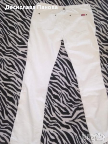 Бял изчистен панталон. Стои изключително стилно и е много удобен. Обличан е 2 пъти по повод, но ми е голям. Размери: Талия – 84 см, Ханш – 92 см, Дължина обща – 91 см, Дължина от чатала – 72 см. Без следи от употреба.