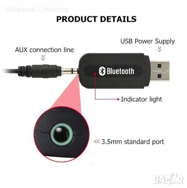 Приемникът разполага от единия край с 3,5мм жак, който се свързва към AUX входа (AUX Input) на колонките, а от другия с USB, което може да се свърже и към обикновено зарядно за телефон (целта е да се захранва приемника). Добавя се като Блутуут устройство към източника на аудио сигнал (компютър, GSM, таблет и тн..) и по този начин слушате звука от компютъра директно на колонките без кабели.