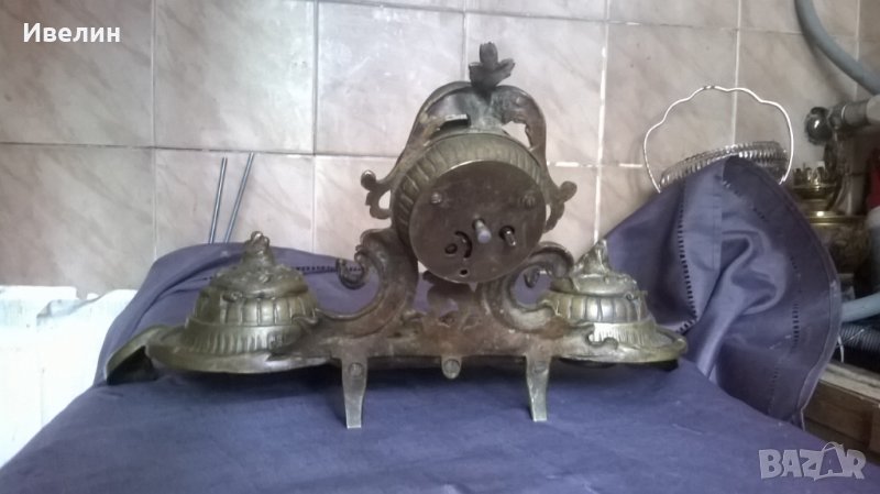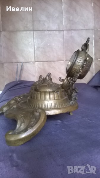стара мастилница рококо.бронзов корпус,висок е 19см,широк 24см,дълбок 20см.механичен часовник.при тестването тръгва и спира.нуждае се от профилактика.внос от франция.