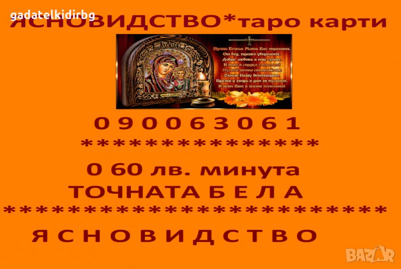 0.60лв.Феноменът Б Е Л А , ясновидство с божествена намеса. СТИЛ СВОБОДЕН, с помощта на духовен водач, Точни решения при любовни и семейни несгоди, как да подобрите еждневният си живот. . Попитай точното таро, разкриват неподозирани истини за вашата съдба и ви подсказват , как да постъпите в определен момент. Какво ви пречи да успявате. 100% ясновидство за всички любители на истината. НЕ ПЛАШИ хората с магии и не злоупотребява с болката . ТОЧНИТЕ предсказания за важни за вас , те ще ви помогнат за осъществяване на дейности свързани с вашето бъдеще и настояще, относно социални проблеми , успешна кариера, бизнес , любов, семейство. Лечебни масажи за гр.София ДОВЕРЕТЕ се на СИЛАТА НА ЕНЕРГИЯТА ***РЕЙКИ ЛЕЧЕНИЕ за цялата страна по телефона от разстояние