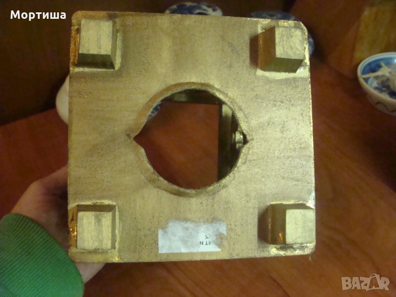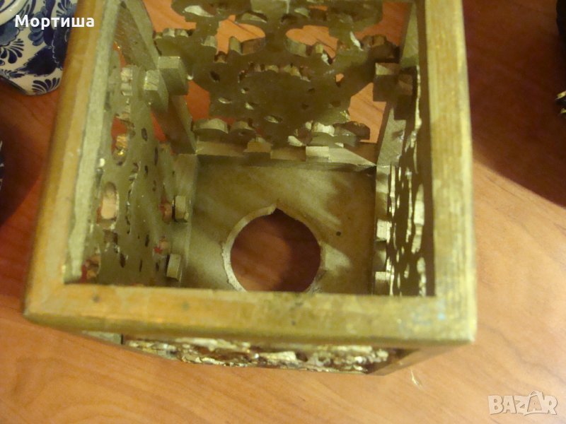 Изработен от дърво орнаментите са твърда пластмаса окъпан в златна баня .За малка свещ но може да се използва и за друго .Височина 18 см Отвор с размер 11 на 11 см Без забележки не е използван Крайна цена