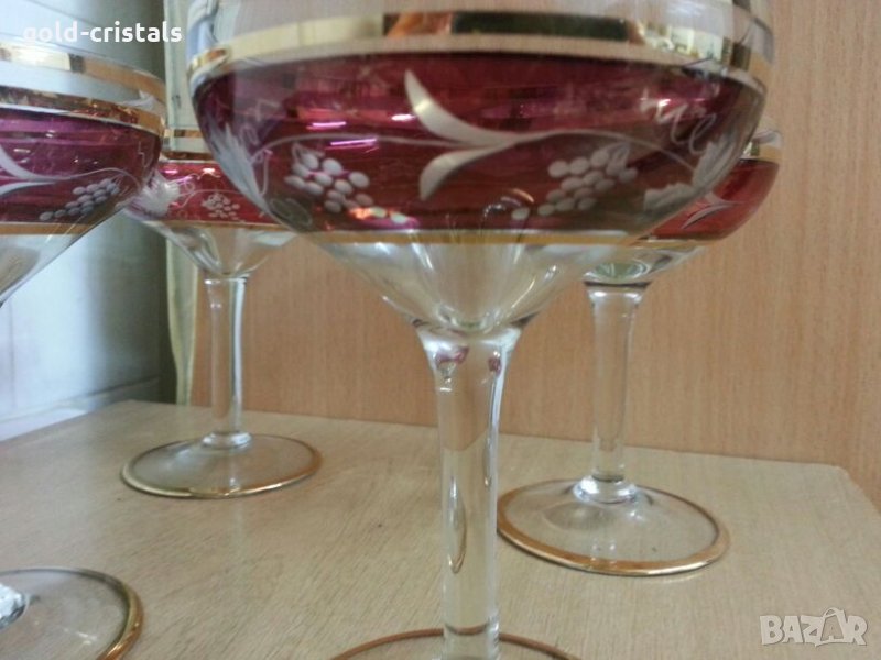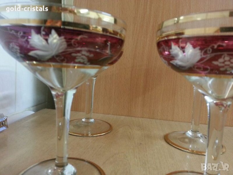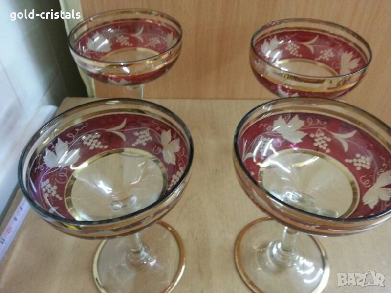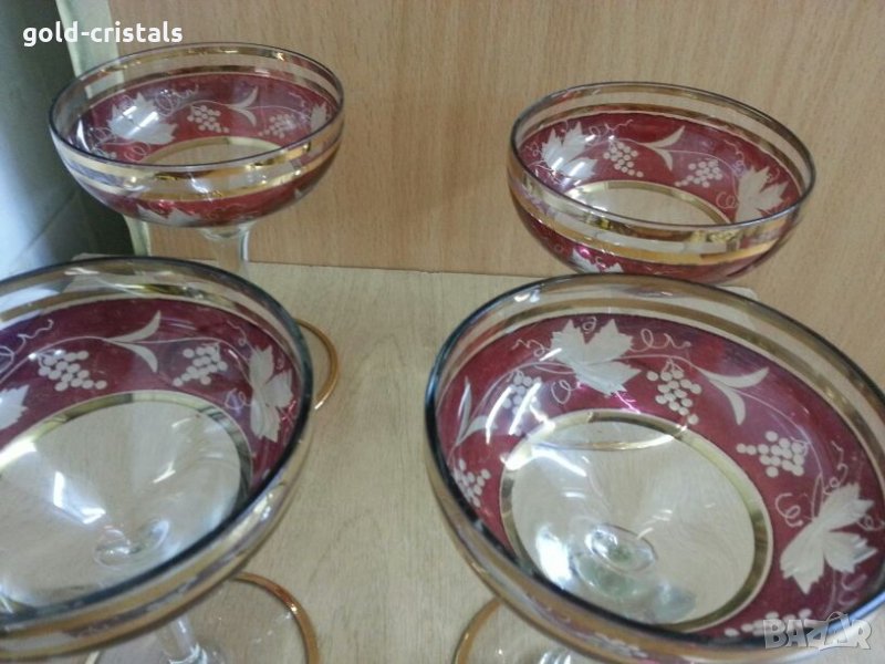 Антикварни стъклени чаши 4бр с позлата гравирани кристално стъкло цветно стъкло сервиз комплект сет лот ретро арт декор винтидж колекция стари старинни антикварни предмети обзавеждане за дома и семейството подходящи за подарък за ценители и колекционери