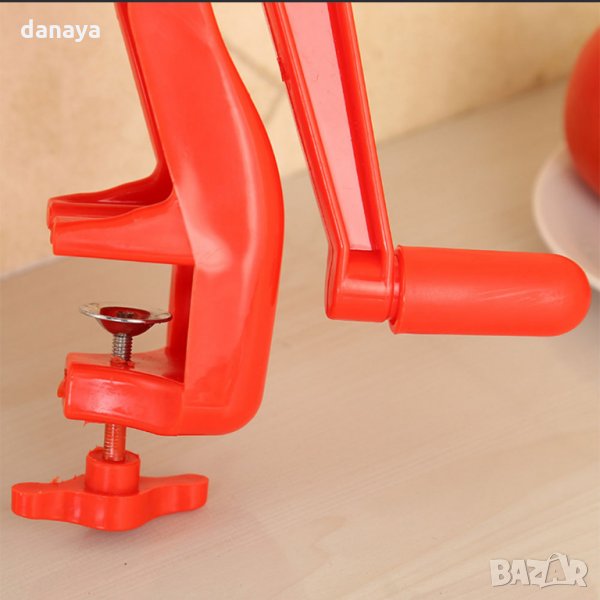 мелене на домати, която отделя семките и люспите на доматите. Машинката може да се използва и за изцеждане на пресни сокове от меки плодове.