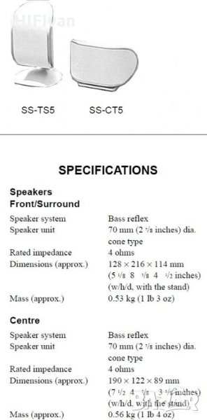 · 4 x SONY SS-TS5 (фронтове и сателити): 4 Ohm, с размери: 128 × 216 × 114 mm. Тегло: 0,53 kг. (единична цена 68 лв.);