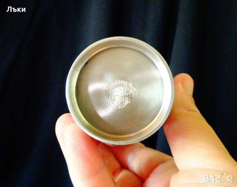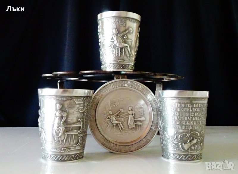 от 95% калай и 5% сребро,маркирана.Има гравирана релефна картина на мъж,седнал на маса с кана,вдигнал чанта в ръка и дама,на която говори.Има надпис,който гласи: