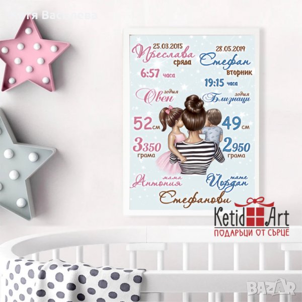 Паното включва информация за дата, час и ден на раждане, ръст и тегло при раждане.