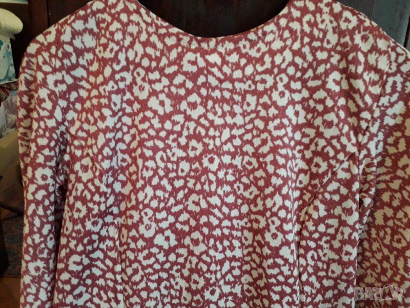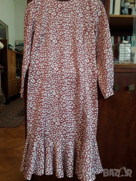 Дамска рокля с дълъг ръкав от тънка лятна немачкаема материя в два цвята, отдолу платката е разкроена. Дължината покрива коляното. Размер М-Л рамене 38 см, бюст 44 см /обиколка 88 см, талия - 40 см /обиколка 80 см/, ханш 46 см /обиколска 92 см/, дължина 93 см с разкроената платка, ръкав 50 см. Отговарям на съобщения тук или т. 0887780808, изпращам с куриер или лично предаване в София.