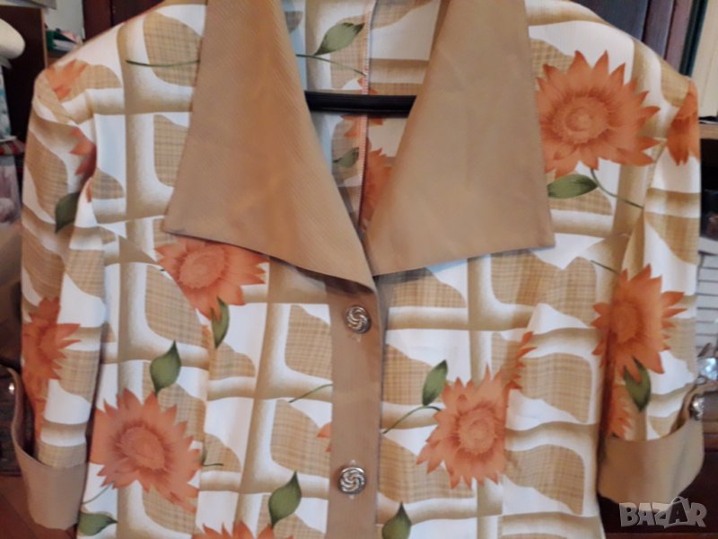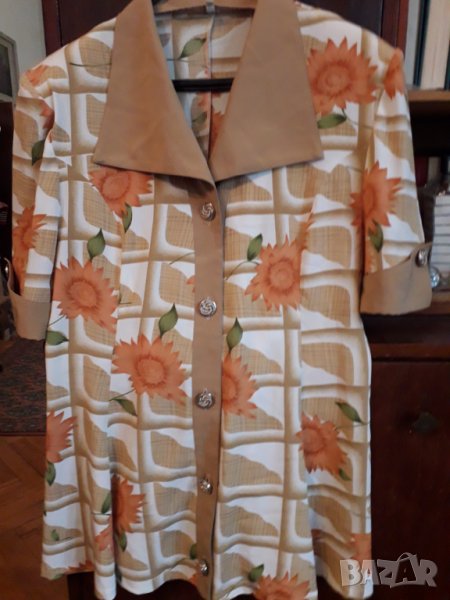 Дамска туника със среден ръкав с подплънке на раменете, с по-голяма яка, с големи копчета отпред. Цвят в комбинация оранжеви цветя на бял и бежов фон, с бежови платки. Размер М - № 44, рамене 44 см, бюст 48 см /96 см/, талия 44 см /обиколка 88 см/, ханш 50 см /обиколка 100 см, дължина 70 см, ръкав 29 см. Туниката е като нова. Отговарям на съобщения тук, изпращам с куриер или лично предаване в София.