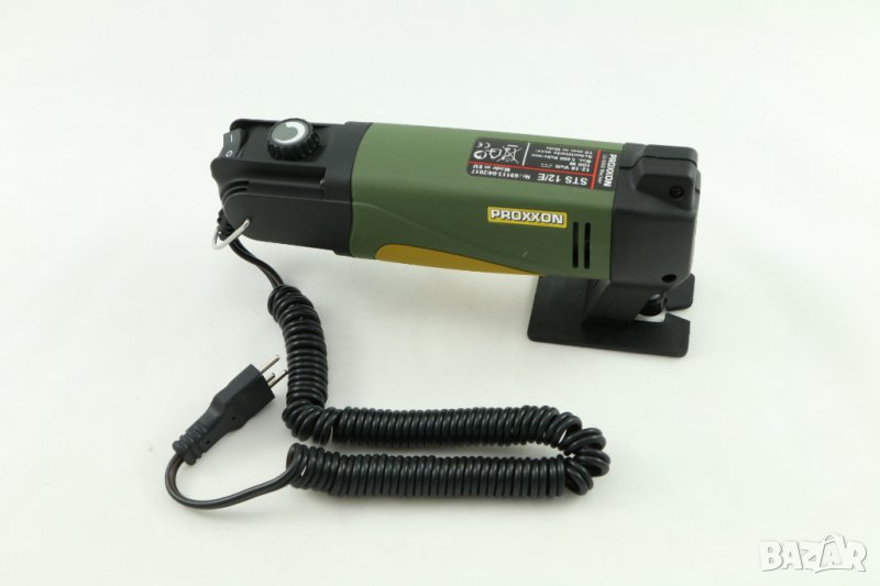 Прободен трион PROXXON /12-18 V, 100 W, Германия. Подходящ за изрязване на криви в дърво (до 10 мм), печатни платки (до 3 мм), немагнитни метали (до 2.5мм). Специален мощен правотоков DC двигател. Безстъпков контрол на скоростта (запазва мощността и при ниски скорости). Корпус от полиамид, армиран с фибростъкло. Окомплектован със сферичен адаптер за работа по изпъкнали и вдлъбнати повърхности. Включва 2 триончета (грубо и фино). Препоръчва се употребата на MICROMOT адаптери с 2.0A ампераж. Захранване 12 - 18V.