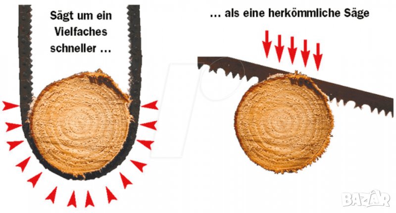 Веригата има 84 елемента със 160 зъба. Веригата е режеща в двете посоки и зъбите са специално направени,, така че да не се задръстват и да не се затяга. Подходяща за труднодостъпни клони, където не може да се работи със стандартен трион. Съхранява се в удобна чанта. Дължина на веригата 77 см, Тегло 450 гр. В комплекта са включени 2 адаптивни дръжки; 4 м капроново въже с оловна тежест;