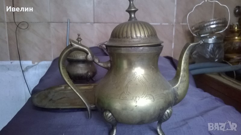 стар бароков сервиз от посребрен бронз.таблата е 22см/15см,каната е висока 19см,захарницата 14см.