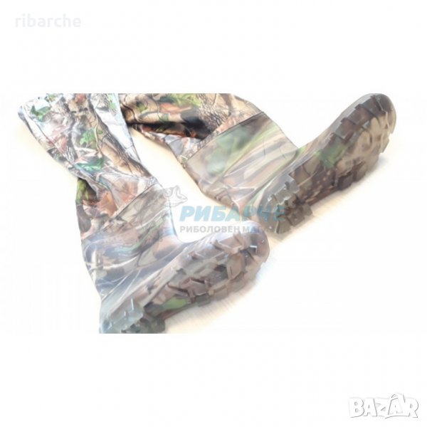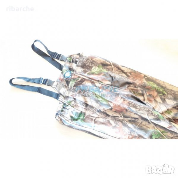 Качествен и надежден ,камуфлажен гащеризон с ботуши , за газене ,направен от дебела, 100% непромокаема еластична материя ,външно подсилена с 2мм еластично гумирано покритие ,което не се цепи , и улеснява движенията ви във водата .Ботушите са допълнително подсилени ,където се свързват с гащеризона ,и са с голям и стабилен грайфер на подметката да предпази от хлъзгане във водата .Номерацията е от номер 42,43,44,45,46