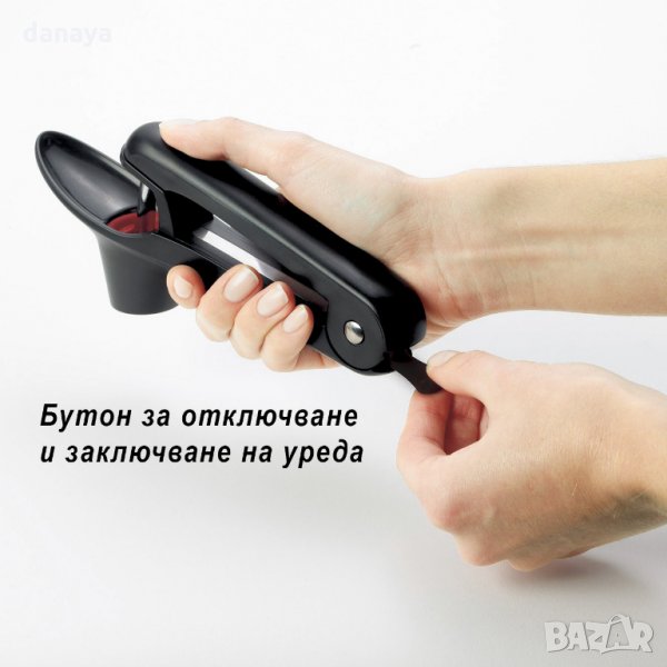 Ръчен кухненски уред за изваждане на костилки от череши, маслини, вишни. Стабилен и здрав прибор за лесно почистване на костилките от малки и големи череши или маслини. Уред за череши, който притежава заключващ механизъм в задната си част. Силиконово гнездо, което държи черешата стабилно, без да се хлъзга. Изработен от пластмаса и метал.