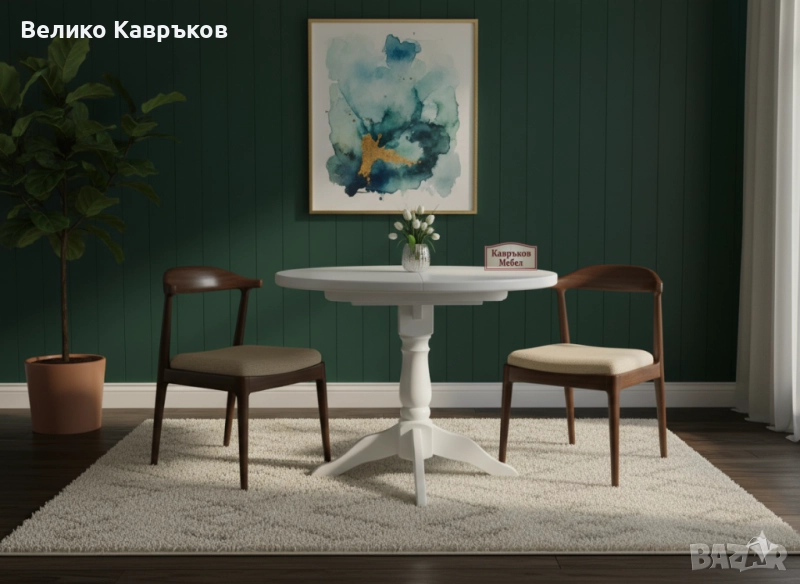 Материал-смърч+МДФ.Масата се разтяга до размер 130х100см,височината е 75см.Може да се изработи и в други размери и цветове.Обработват се с естествени лакове,байцове и бои на водна основа.Магазинът ни се намира на ул."Пиротска"56.