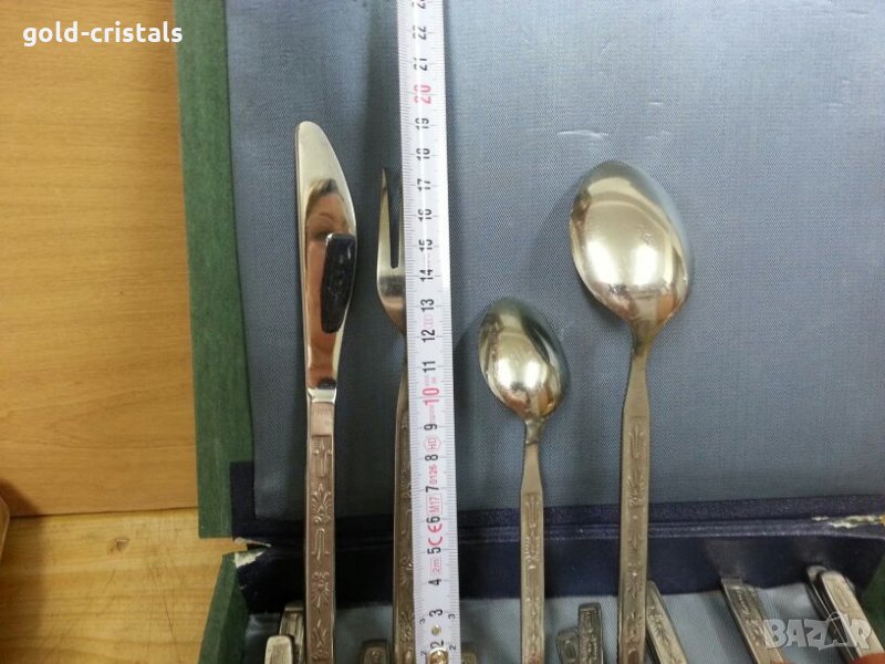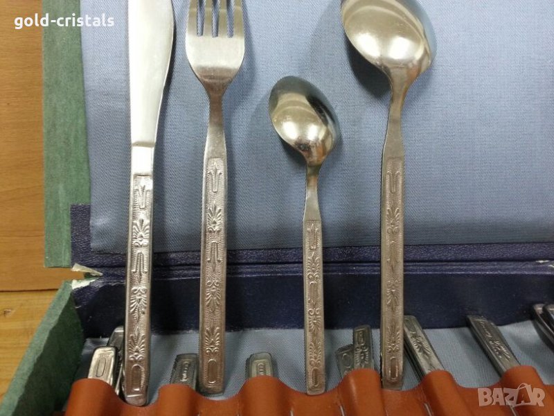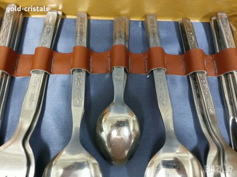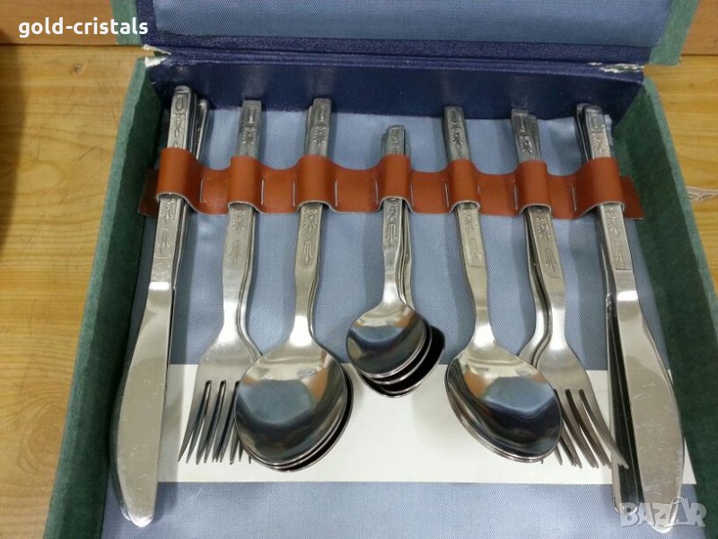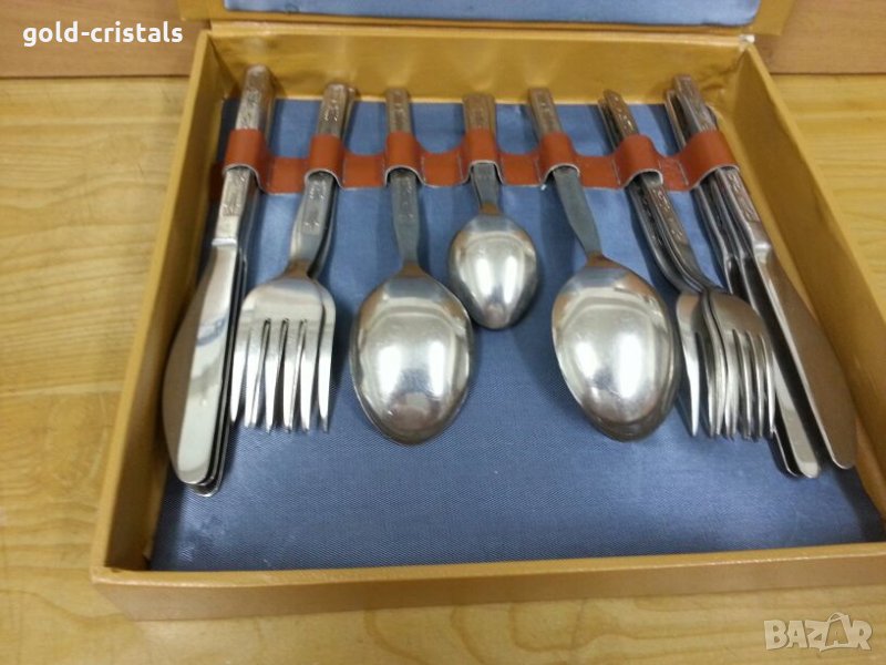 руски прибори за хранене в кутия ножове вилици лъжици лъжички маркирани неръждаеми масивен и дебел материал в перфектно състояние неизползвани съветски ссср комплект сет лот ретро арт декор винтидж колекция стари старинни кухня готвене сервиране хранене гости трапезария подарък празник дома съдове посуда празници сватба годеж юбилей маса