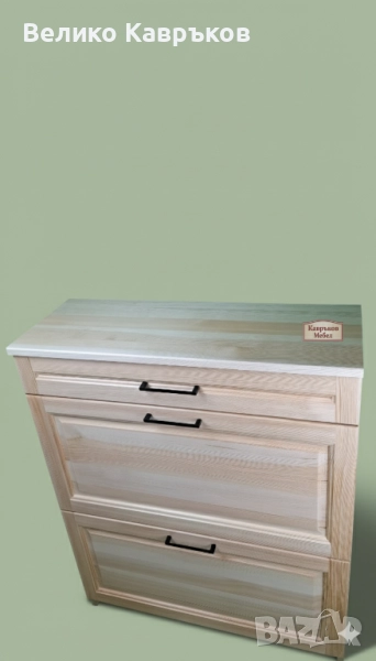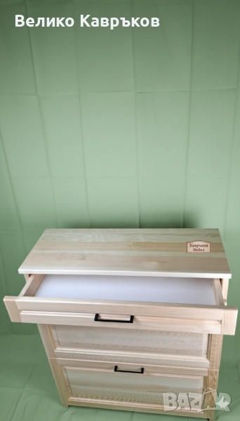 Материалът е масив-бор.Размерите-80х30х100см.Обработва се с естествени лакове,байцове и бои на водна основа и по ваши предпочитания и размери.Магазинът ни се намира на ул."Пиротска"56.
