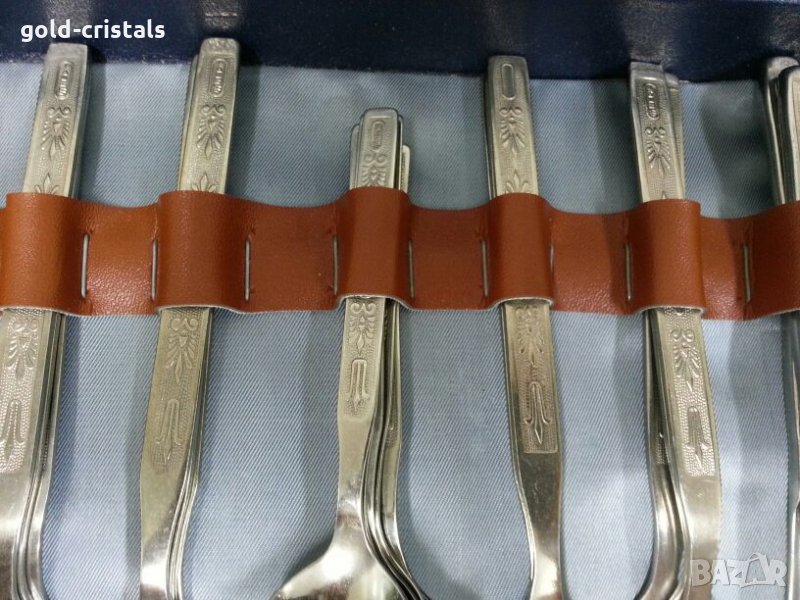 комплект руски прибори за хранене в кутия неизполвани неръждаеми маркирани дебел масивен материал 6бр ножове 6бр вилици 6бр лъжици 6бр чаени лъжички неизползвани съветски ссср сервиз комплект сет лот ретро арт декор винтидж колекция стари антикварни предмети обзавеждане за дома и семейството