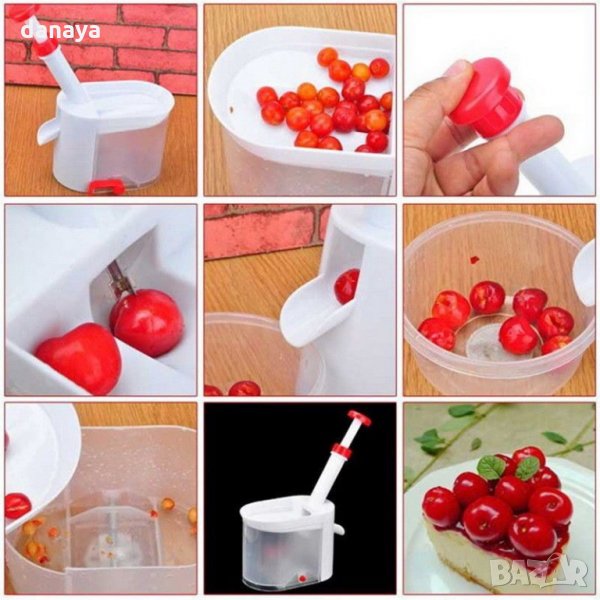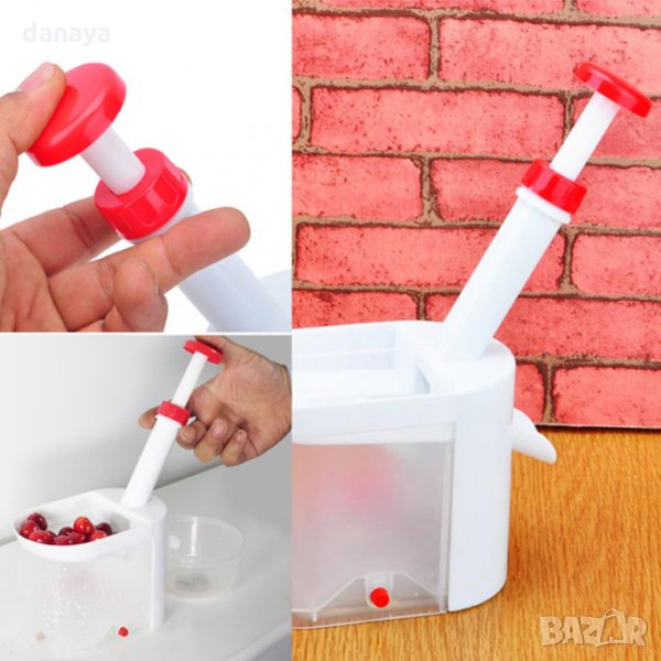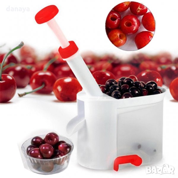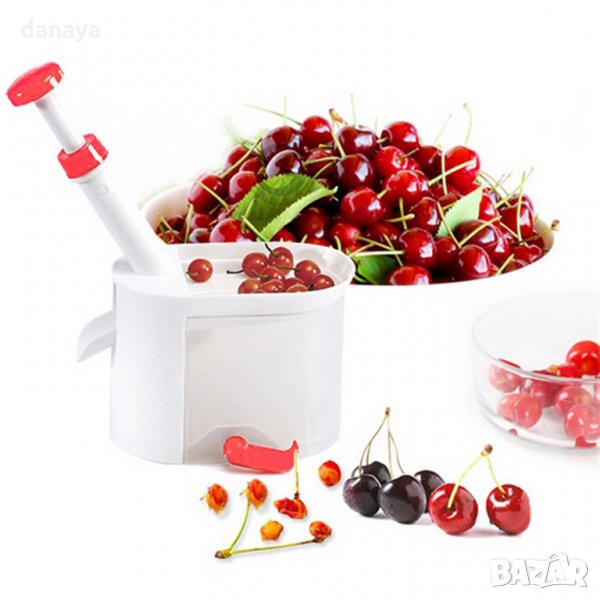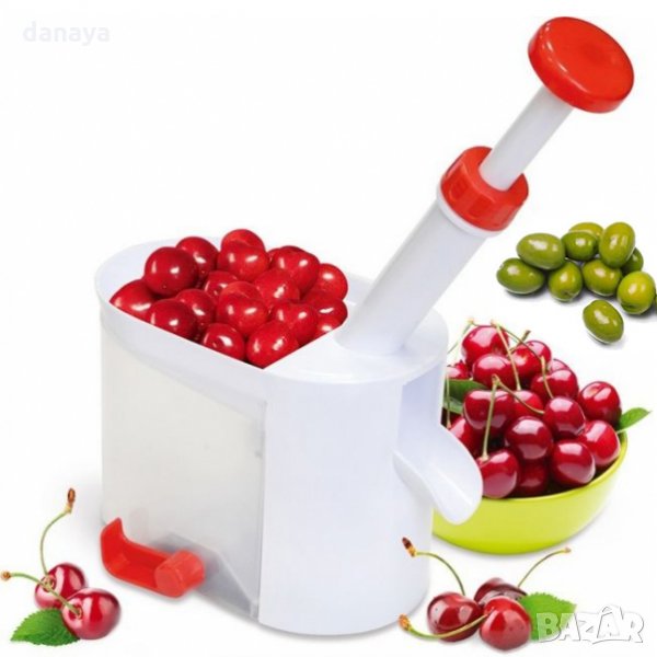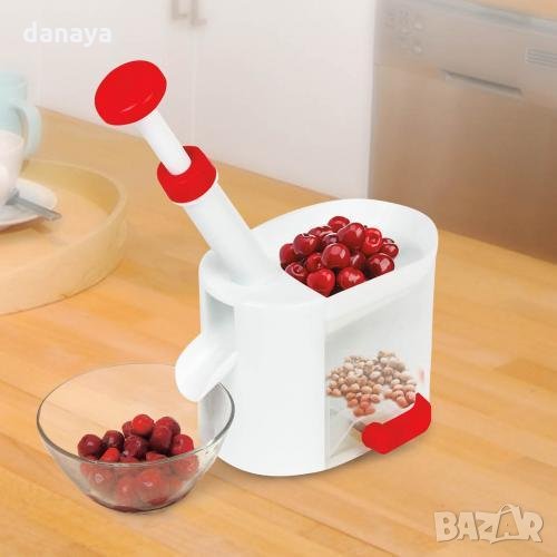 костилки с контейнер. Машинка за череши, вишни, маслини. Ръчна машинка за вадене на костилки от череши лесно и бързо. Уреда е изцяло механичен и не се нуждае нито от ток, нито от батерии. Вградена долна вакуумна част за стабилно закрепване на уреда върху всякаква гладка повърхност. Контейнер за събиране на костилките. Остър стоманен нож с бутало. С уредът се работи лесно и бързо - поставяте шепа череши в него, натискате буталото и черешата излиза без костилка през отвора встрани. Полезен и нужен ръчен кухненски уред, идеален за приготвяне на сладко от череши или вишни.