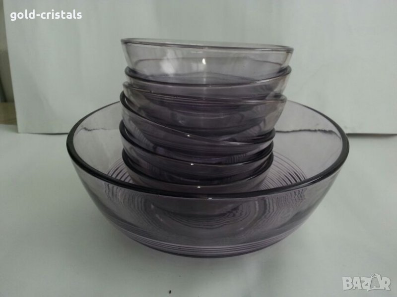 Ретро стъклени купички и купа фруктиера цветно лилаво стъкло 6бр купички и 1бр голяма купа фруктиера неизползвани без забележки сервиз комплект сет лот ретро арт декор винтидж колекция стари антикварни предмети обзавеждане за дома и семейството